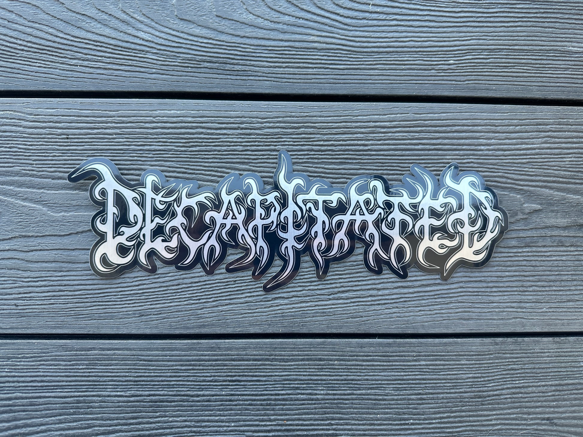 Decapitated silver logo sticker.
